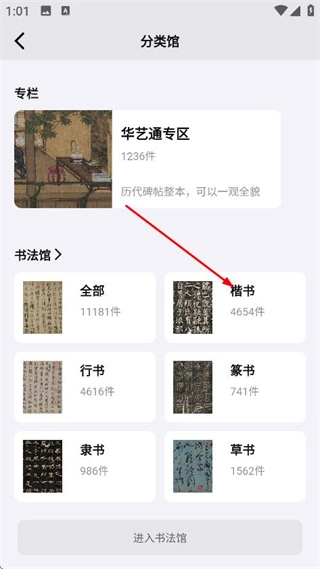 在分类馆页面,点击楷书,进入书法通史楷书页面。
