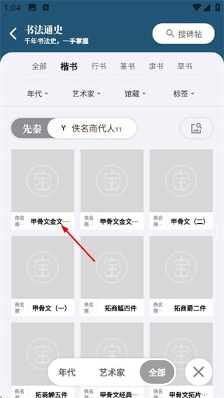 在书法通史的楷书板块中,点击“佚名商代人”这一选项,即可查看与之相关的书法作品。