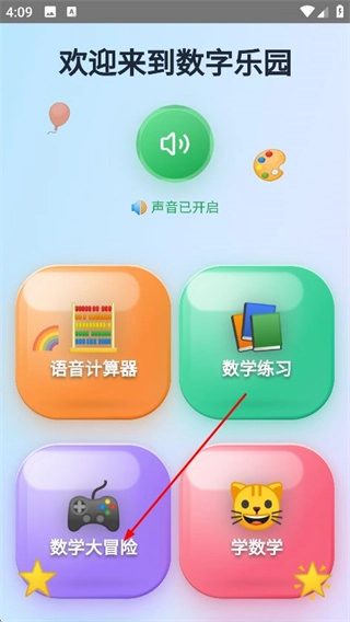在“欢迎来到数字乐园”界面,点击“数学大冒险”选项,即可进入数学大冒险的关卡选择页面。