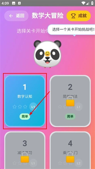 在数学大冒险的关卡选择界面,点击数字认知关卡,即可进入该关卡的挑战准备界面。