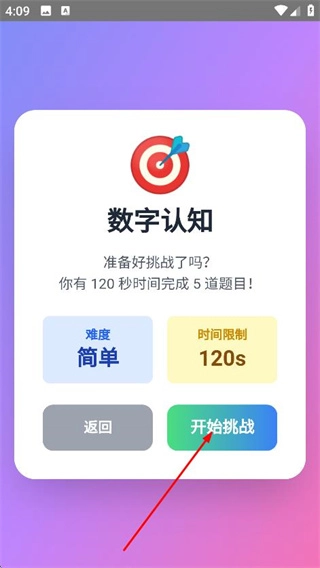 在数字认知挑战的准备页面,点击“开始挑战”按钮,即可进入数字认知题目的挑战页面。