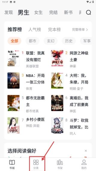 打开小说阅读类应用,点击底部的分类选项,进入分类页面。