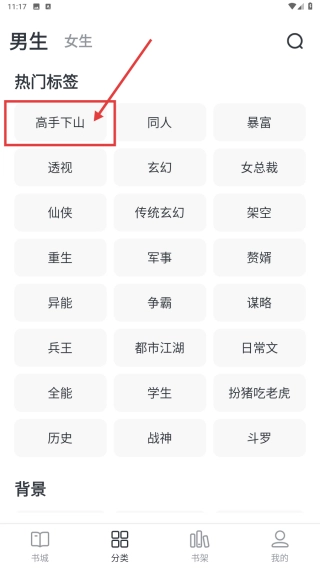 在分类页面,选择男生分类下的“高手下山”标签,进入该标签的小说列表页面。