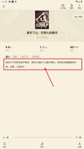 挑选《高手下山:开局九封婚书》这部小说的条目,进入到小说的详情页面。