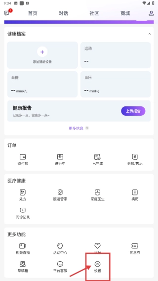 打开医疗健康类应用后,点击右上角的个人中心图标,即可进入个人中心页面。