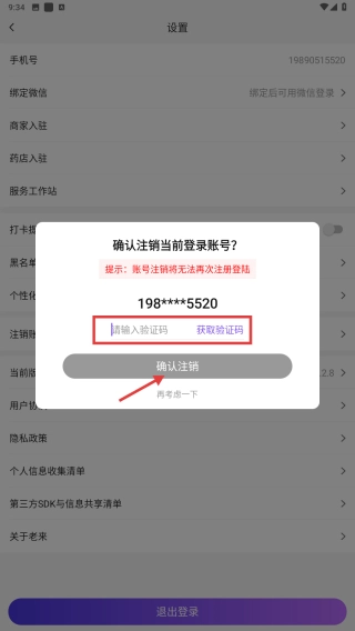 请输入验证码,接着点击确认注销按钮,即可完成账号注销流程。
