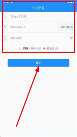 依次填写手机号、验证码和密码,勾选相关选项后点击确定按钮,即可完成注册流程。