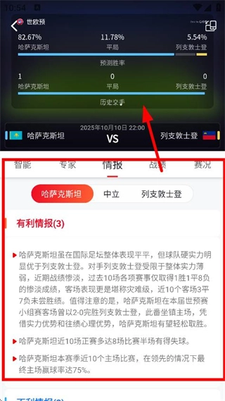 在比赛详情页面,能够查看比赛的相关情报,例如有利情报之类的内容。