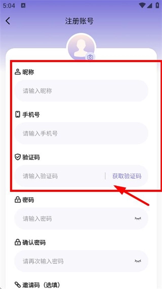 在账号注册的信息填写页面,依次输入昵称、手机号,接着获取并填写验证码。