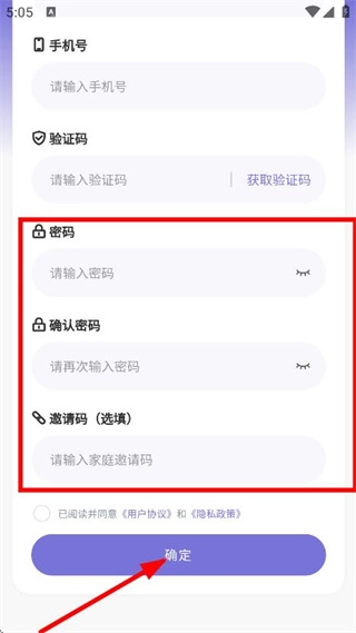 输入密码、确认密码,邀请码为选填项,勾选相关协议后点击确定按钮,即可完成注册流程。