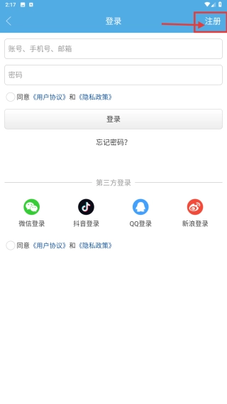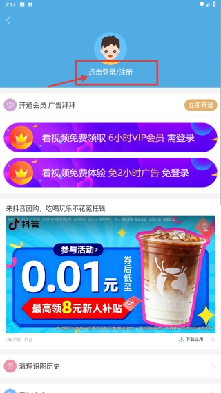 在个人中心页面,点击登录/注册区域,即可进入登录/注册界面。