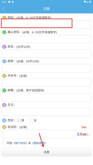 在注册页面,按顺序填写6-20位字母或数字组成的密码,然后点击注册按钮,即可完成账号注册流程。