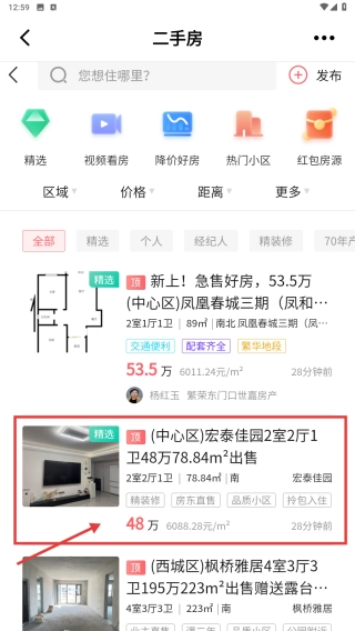 在二手房房源列表中,定位到中心区域宏泰佳园小区的2室2厅1卫房源信息,点击该条目查看详细内容。