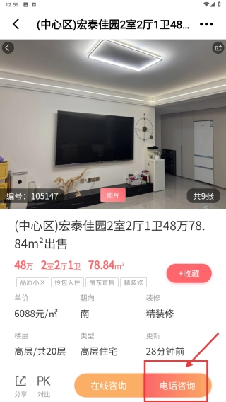 在房源详情页面,点击电话咨询按钮,即可发起房源咨询的操作。