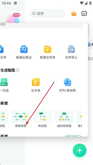 当弹出操作选项后,选择其中的思维导图选项,即可进入思维导图的编辑界面。