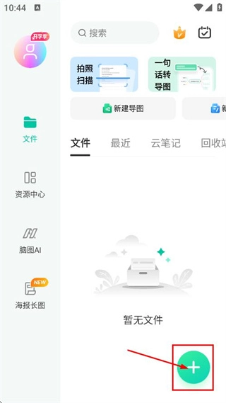 在万兴脑图的主页面,点击右下角的加号图标,系统会弹出相关的操作选项。