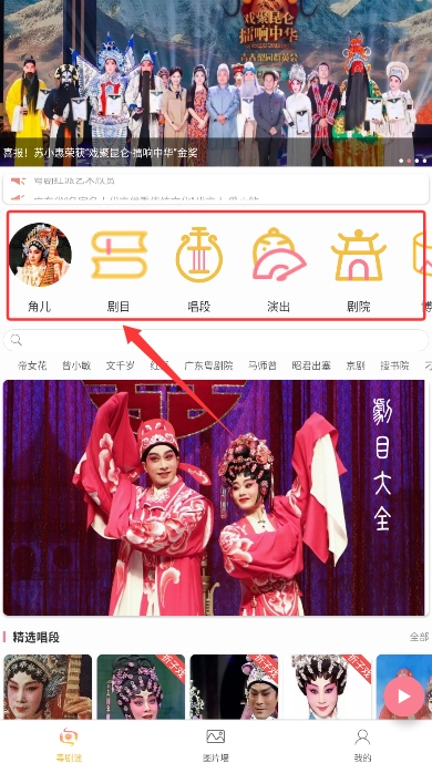 主页面设有角儿、剧目、唱段等分类,您可自由选择心仪类型进入浏览。