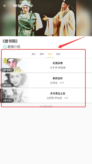 进入剧目详情页面后,在唱段栏目里,可查看初遇诉情、柴房自叹等唱段的具体内容。