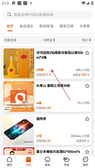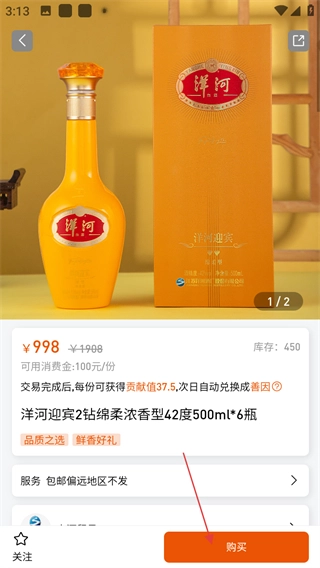 在商城页面,找到洋河迎宾2钻绵柔浓香型商品并点击,即可进入该商品的详情页面。