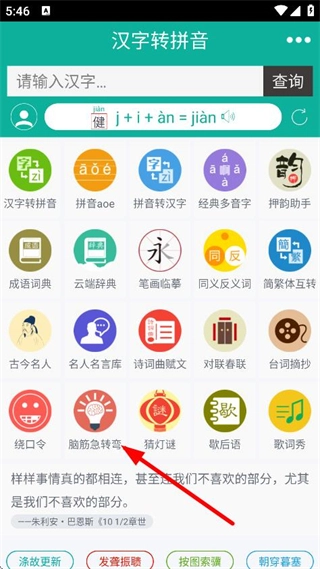 汉字转拼音作为一款汉语学习辅助工具,专注于普通话水平提升与汉字认知能力培养,具备离线汉语发音功能、字词典深度查询服务,以及成语解析、诗词曲赋文跟读等模块。此外,它通过互动式笔画动画展示和实时描红反馈机制,助力用户攻克生僻字识别难关、规范汉字书写习惯,适配学生拼音启蒙教育与成人普通话矫正学习场景,是日常汉语学习过程中的实用帮手。