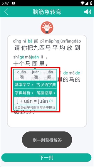 点击题目里的多音字,就能查看这个字的拼音等相关信息。