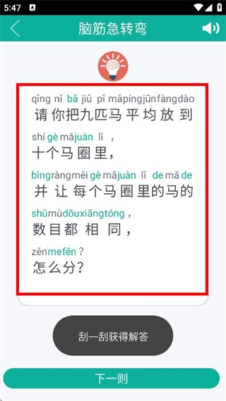 在软件的主界面中,找到并点击“脑筋急转弯”选项,即可进入脑筋急转弯的对应页面。
