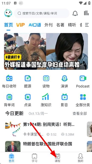 在可可英语的首页,点击底部的课程选项,即可进入课程页面。