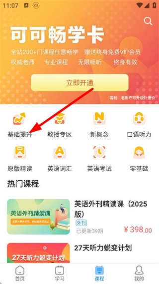 在课程页面,点击“基础提升”选项,即可进入基础提升类课程的列表页面。