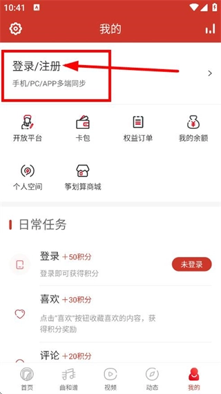 在个人中心页面,点击登录/注册按钮,即可进入登录注册选择界面。