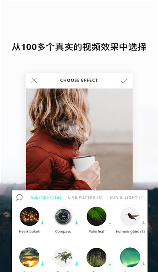 实时摄像头特效:支持在拍摄时直接应用Heart touch、Compass等特效,直播或录视频一键增强氛围感。