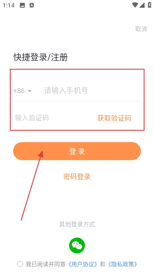 在登录页输入手机号,验证码,勾选协议后点登录。