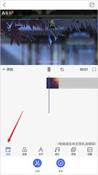 5、点击【剪辑】按钮,即可对视频执行分割、变速等相关操作;