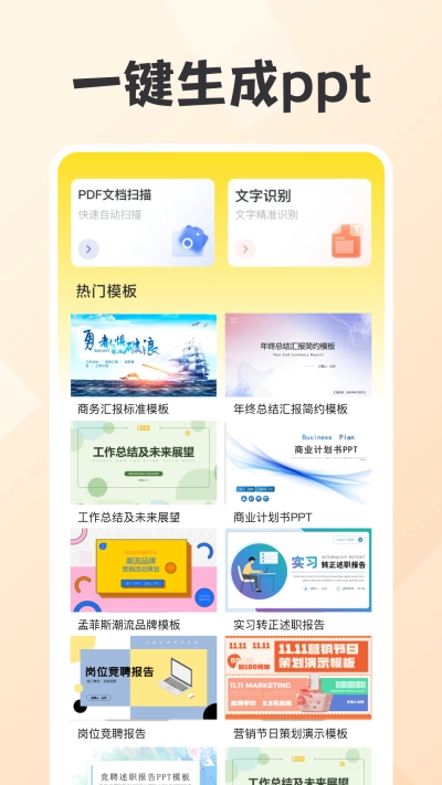 ppt生成助手是一款旨在提升办公效率的实用办公工具,拥有海量丰富的ppt模板,可助力用户快速完成所需ppt文案的制作,极大节省办公时间与精力。用户无需从零开始设计,直接套用对应模板即可制作出具备专业水准的ppt,从而在工作汇报、项目展示等场景中充分展现个人能力。