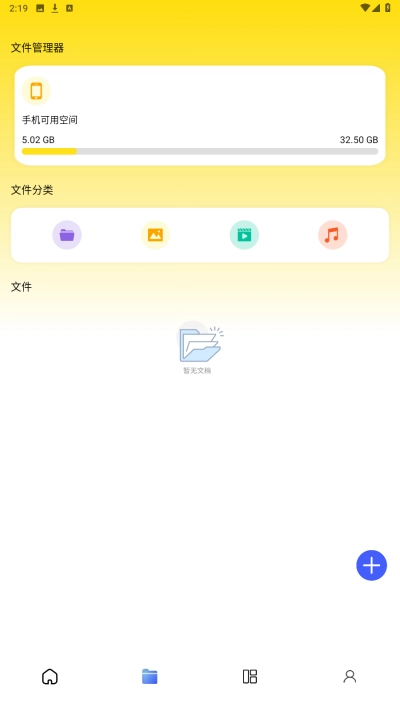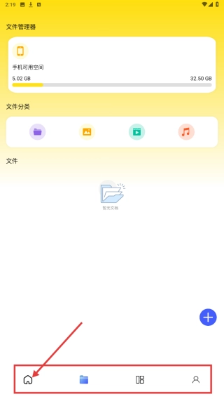 打开文件管理类应用,点击底部的首页选项,即可进入首页界面。