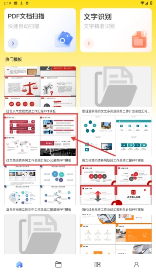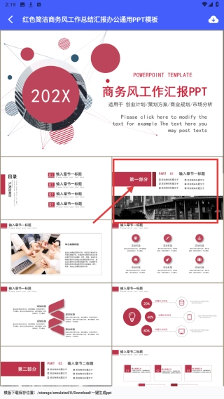 在首页界面,找到并点击红色简洁商务风工作总结汇报办公通用PPT模板,进入模板详情页面。