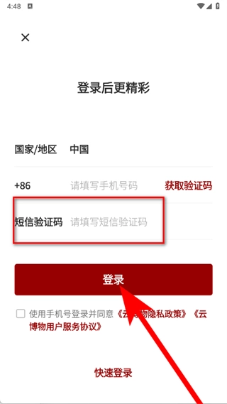 输入短信验证码,勾选同意相关协议后,点击登录,完成注册。