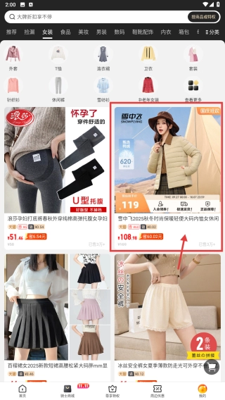 在折扣页面,点击女装分类标签,筛选女装类商品。