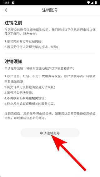在账号注销页面,点击“申请注销账号”按钮,提交账号注销的申请。