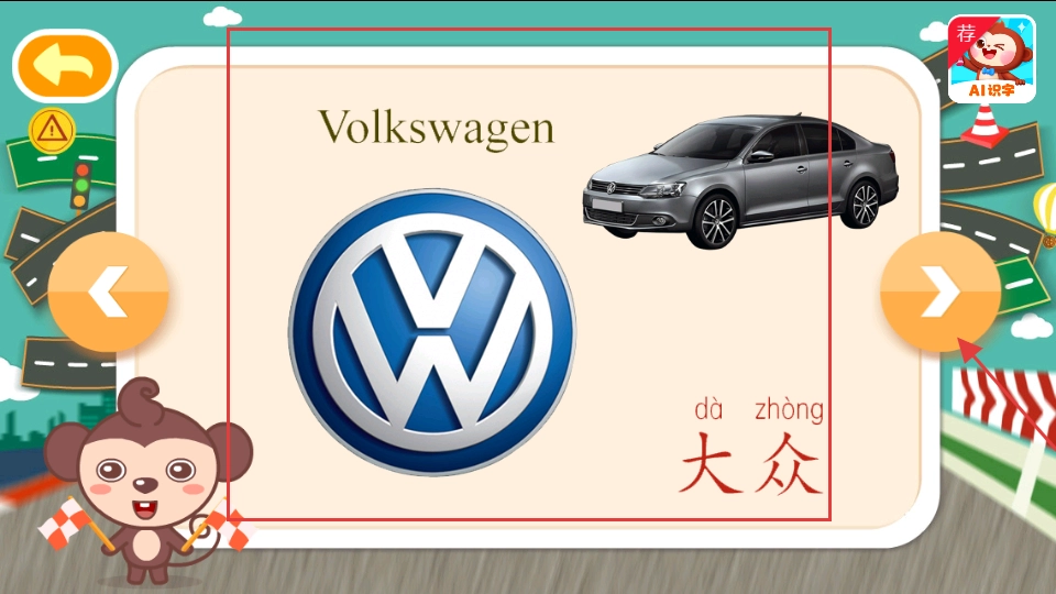 在车标学习页面,你可以查看大众车标以及相关的车辆信息,点击右侧的箭头就能继续进行学习。