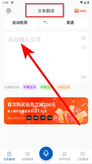 打开全球翻译官,在文本翻译页面,点击输入框。