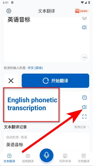 翻译操作完成后,点击翻译结果旁边的喇叭图标,即可播放译文的语音。