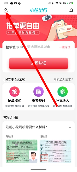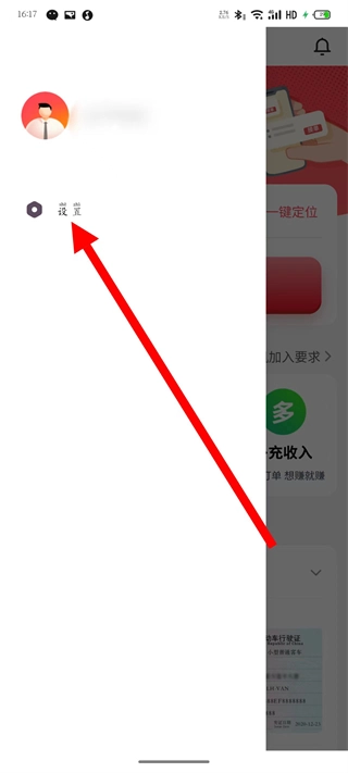 打开小拉出行司机端应用,点击界面左上角的个人图标,即可展开个人功能栏。