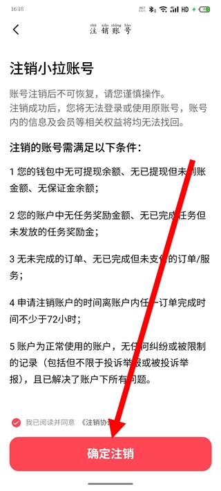 请仔细阅读账号注销的相关条件,确认无误后勾选同意选项,再点击“确定注销”按钮,即可完成账号注销流程。