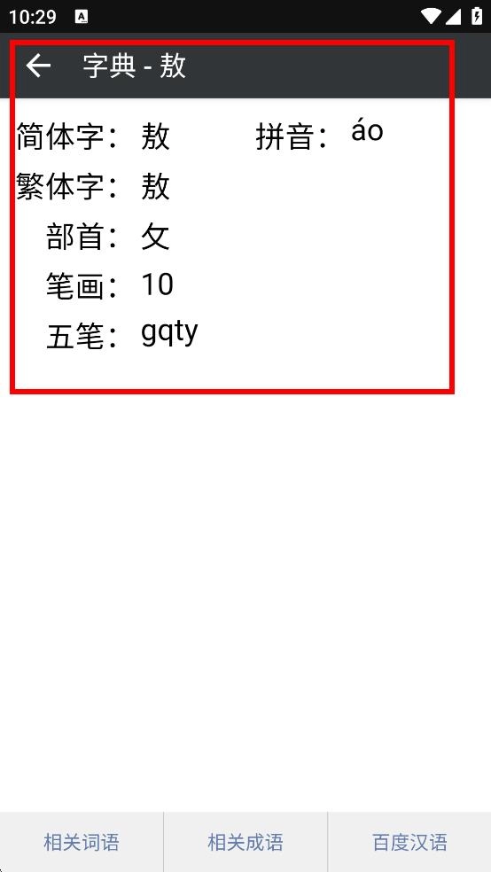 还能查看该字的简体字、繁体字、部首、笔画、五笔等信息。