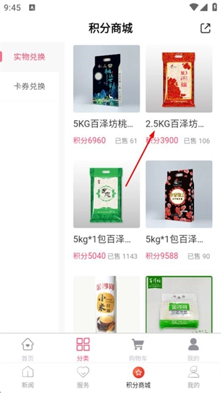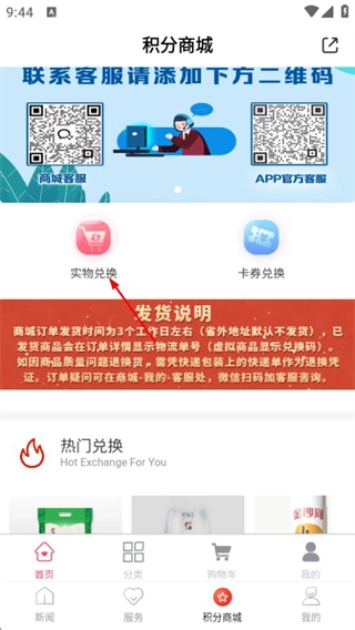 在这个页面上,点击“实物兑换”按钮,就能进入到实物兑换的商品列表页面。