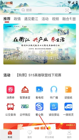 打开e览衢江应用后,点击界面上的“积分商城”选项,就能进入到积分商城的专属页面。