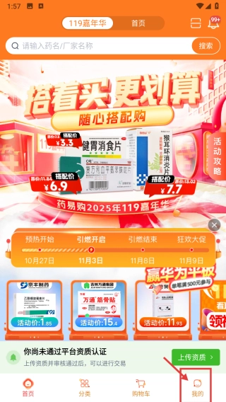 打开医药类首页后,点击页面底部的“我的”选项,即可进入个人中心页面。