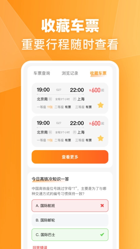 2、行程收藏功能超贴心,车票信息可一键收藏,到站时间会提前提醒,即便临时有事也能从容调整行程,让您的旅程毫无后顾之忧。
