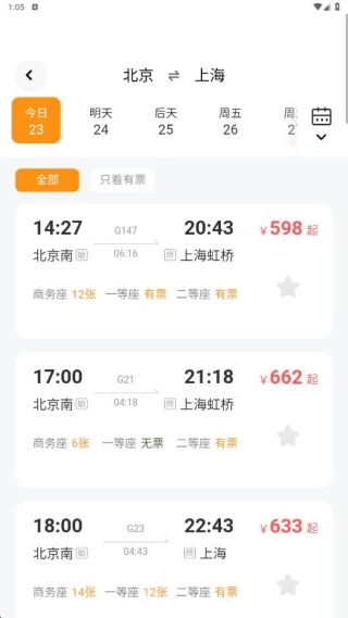 在车票查询板块,我们可自行设定出发与到达城市,以此开展筛选操作。
