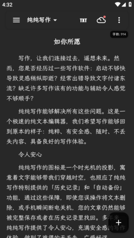纯纯写作2024是一款智能写作工具,用户可以在手机上自由创建各类文本,享受更舒适的写作体验。它具备丰富功能,支持小说存储、章节编辑、离线写作等,欢迎使用。